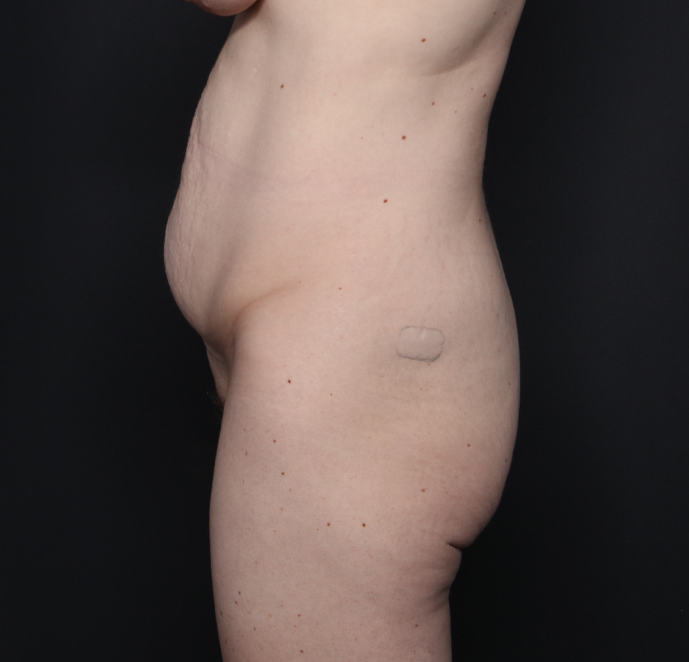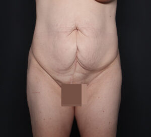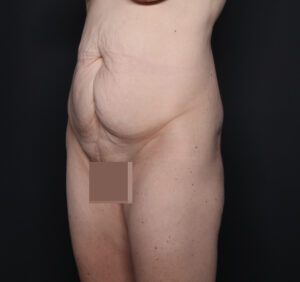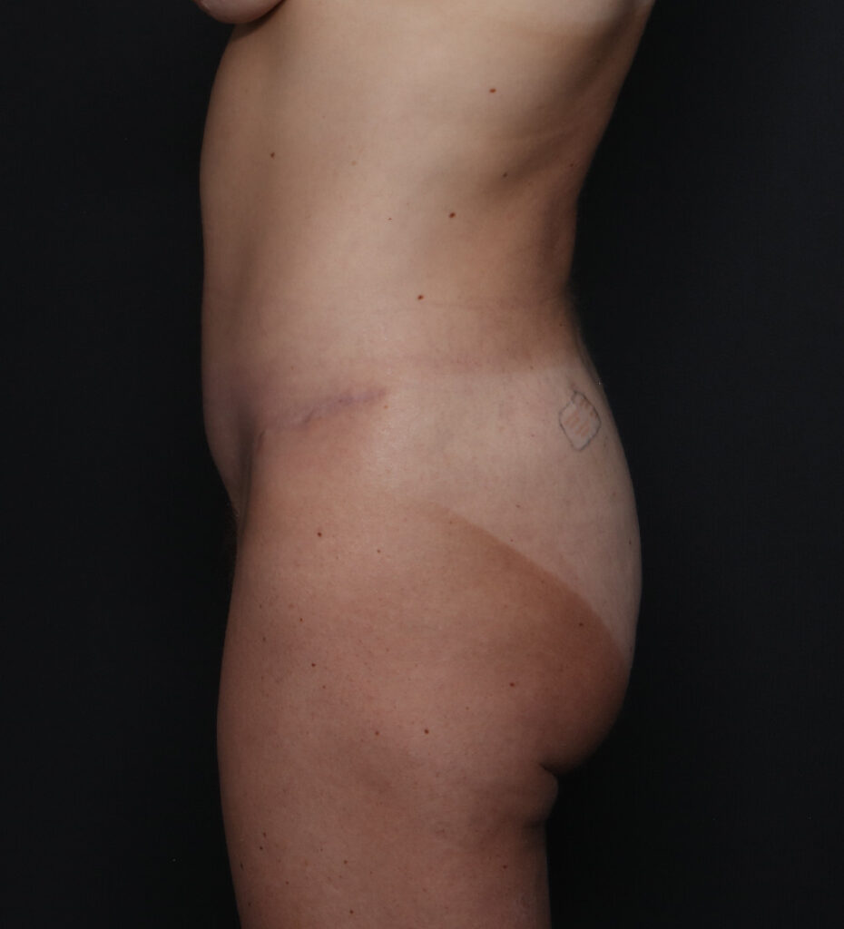 48-year-old woman 4 months following fleur-de-lis abdominoplasty with liposuction, abdominal muscle repair with fat grafting (RAFT) and fat grafting to the hips. The vertical scar is necessary when there is a great deal of horizontal skin laxity that would not be corrected with a standard abdominoplasty.