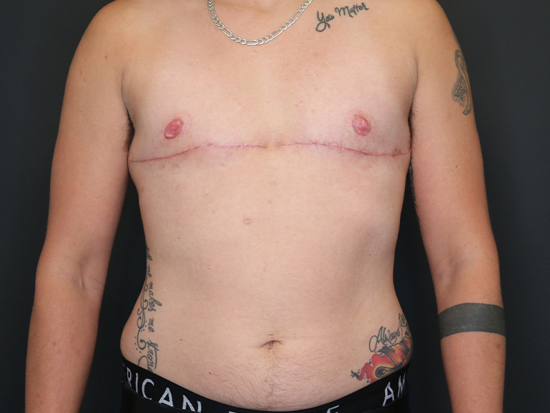 31 year old 6 weeks after double incision top surgery with free nipple grafting.