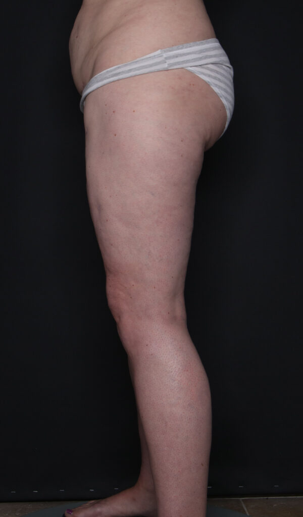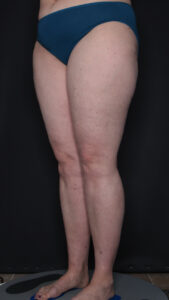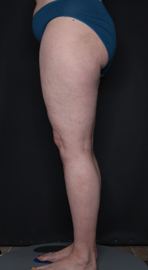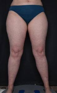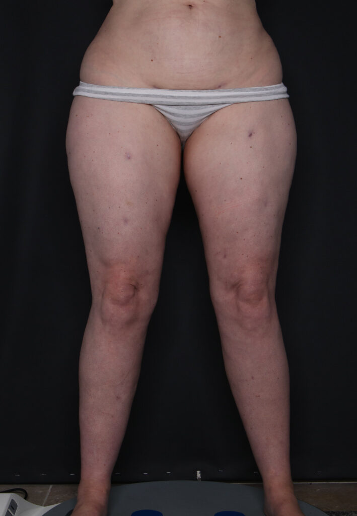 44-year-old woman with stage 1 lipedema. 4 months following treatment of the anterior legs ankles to hips with lymphatic sparing liposuction and manual extraction with removal of 3300cc lipedema per leg. Note the improved kneecaps and leg circumference. The abdomen was also treated with removal of about 3 liters.